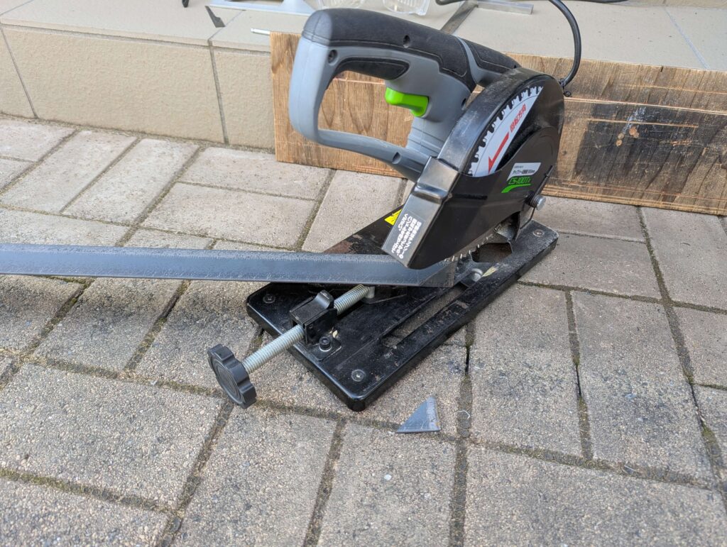アングルを4本チップソー切断機で切り出し、両端を45°に切り落として、四角の枠が組めるようにしました。