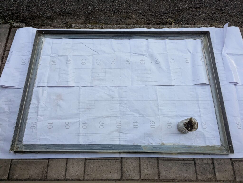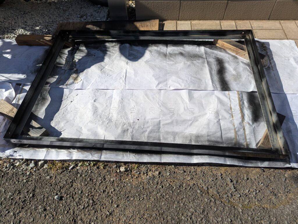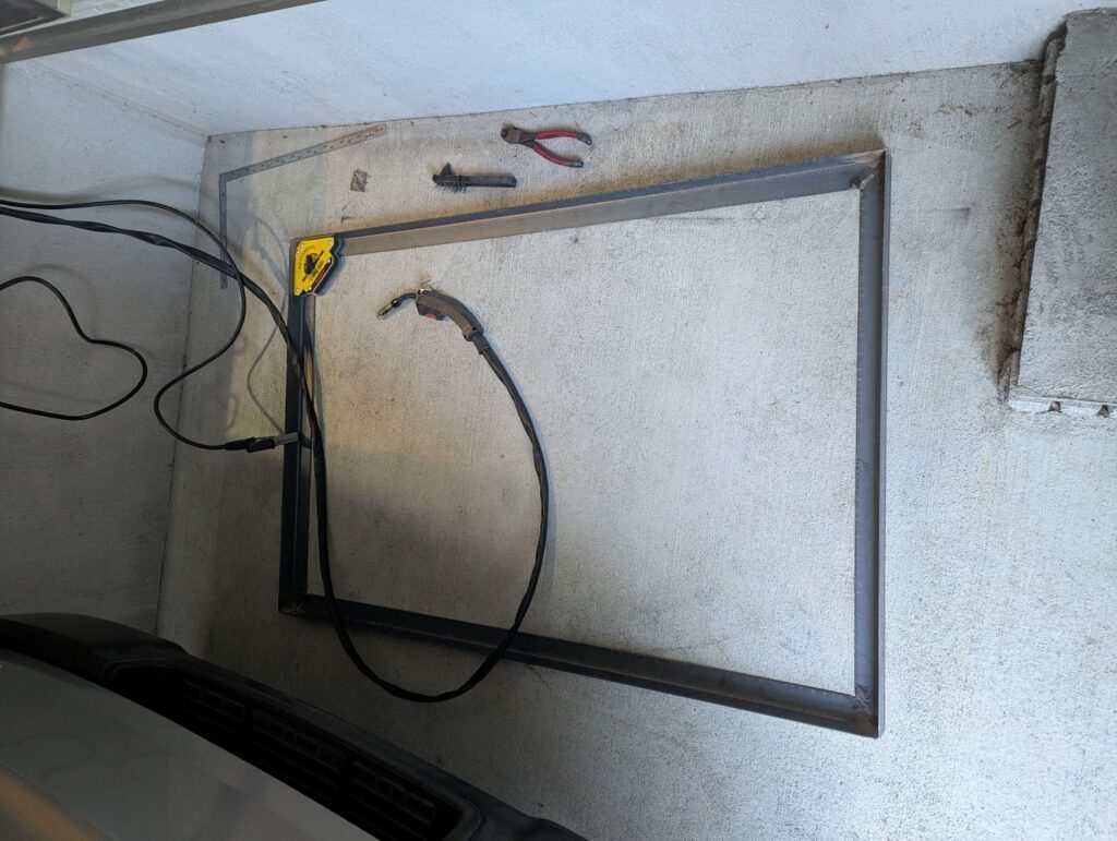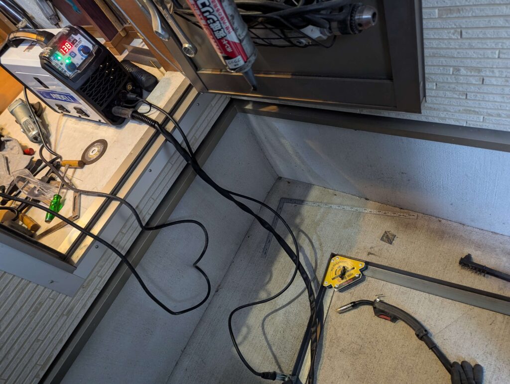 テーブルアングル枠を駐車場の僅かな隙間で、腰を痛めつつなんとか溶接完了しました。