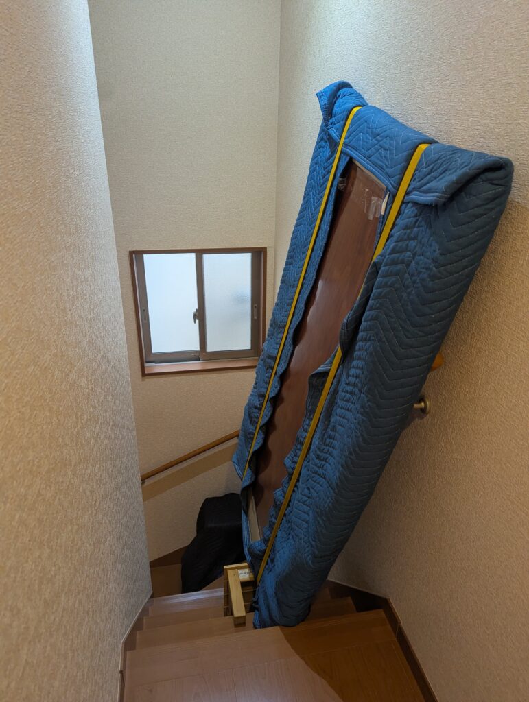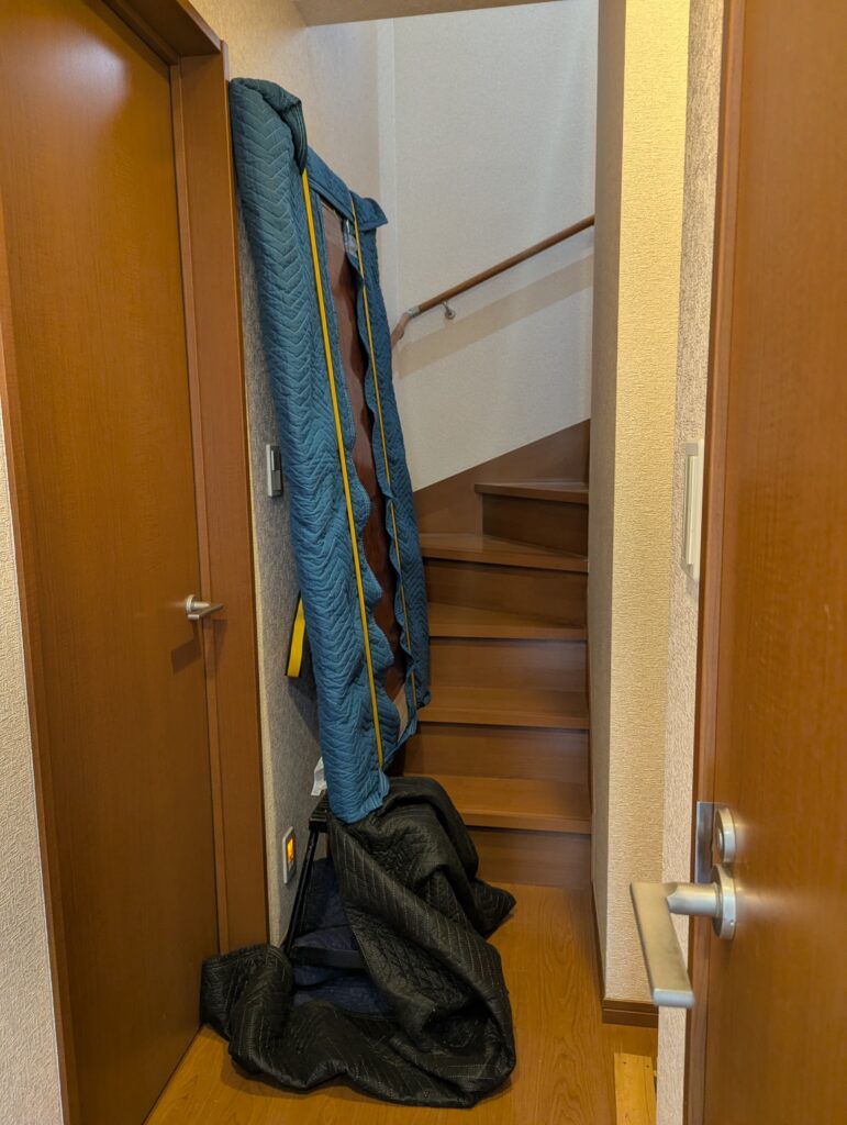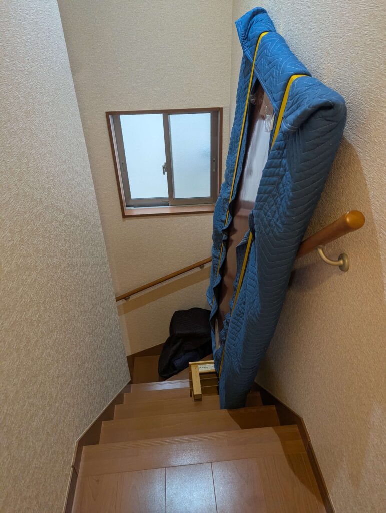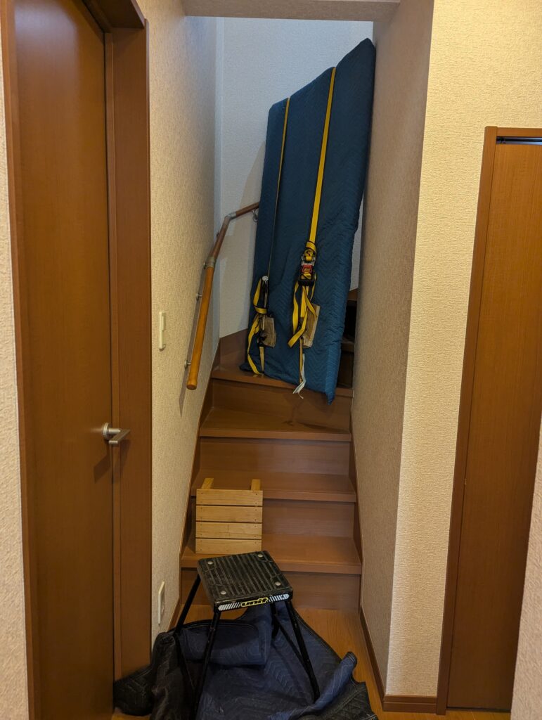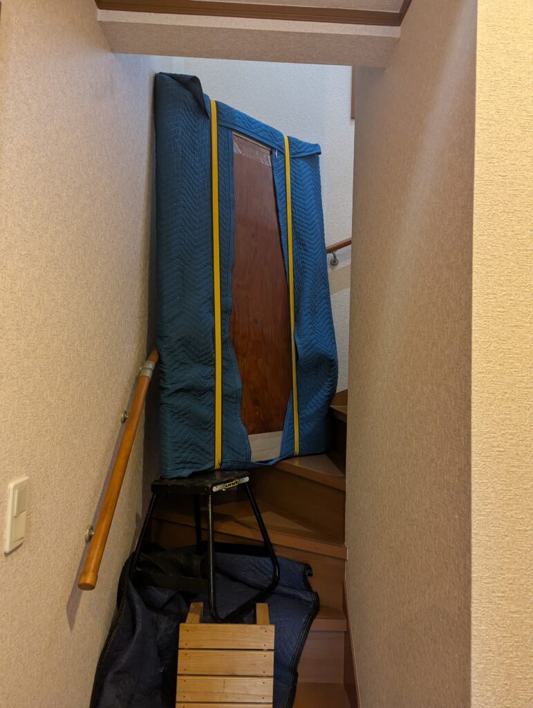 二階のリビングへ上げる階段では、一枚板を養生マットで包み荷締めベルトラチェットで締めて背負って上げるつもりでしたが、
