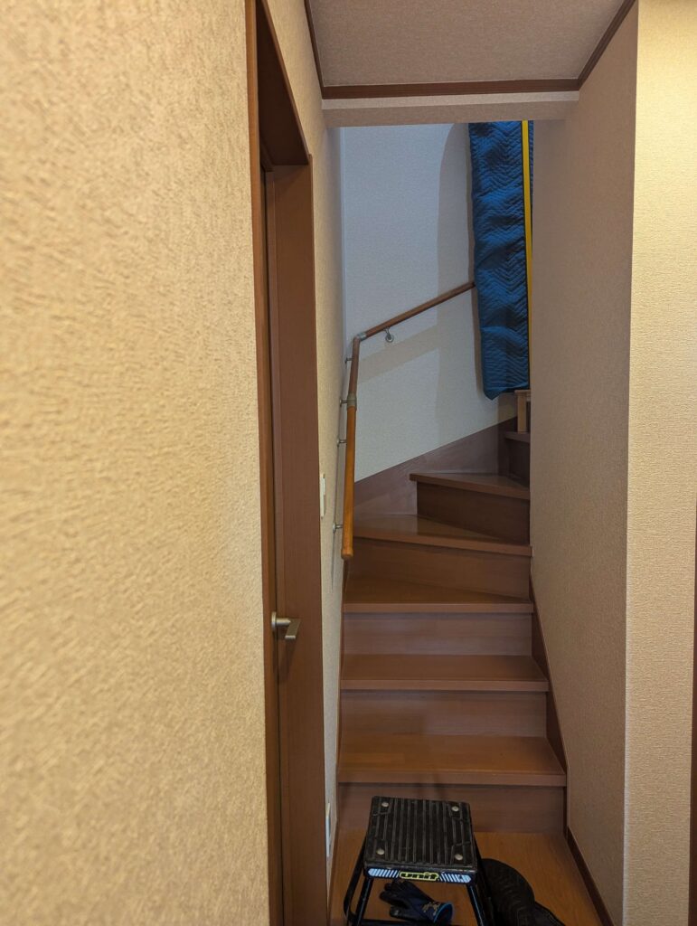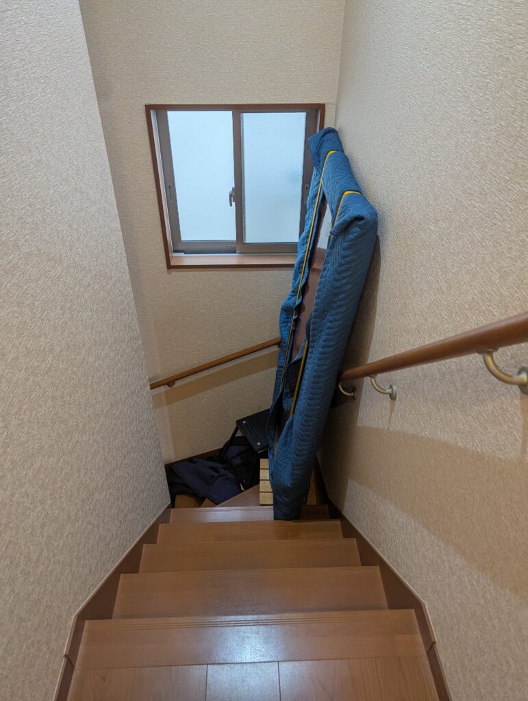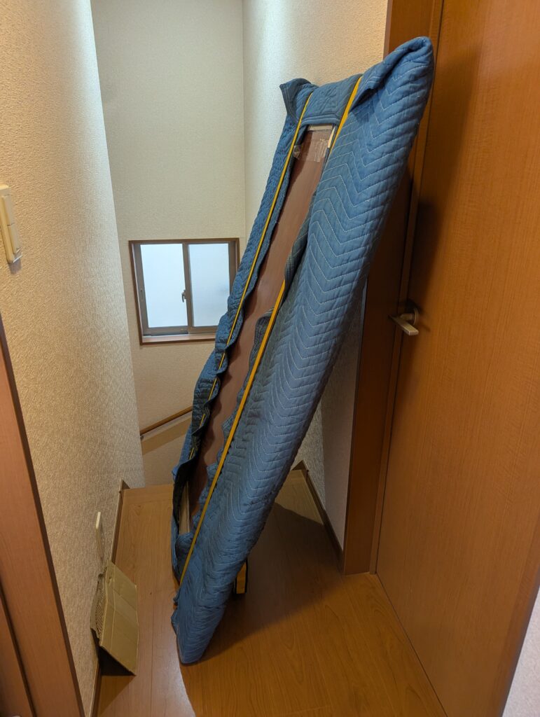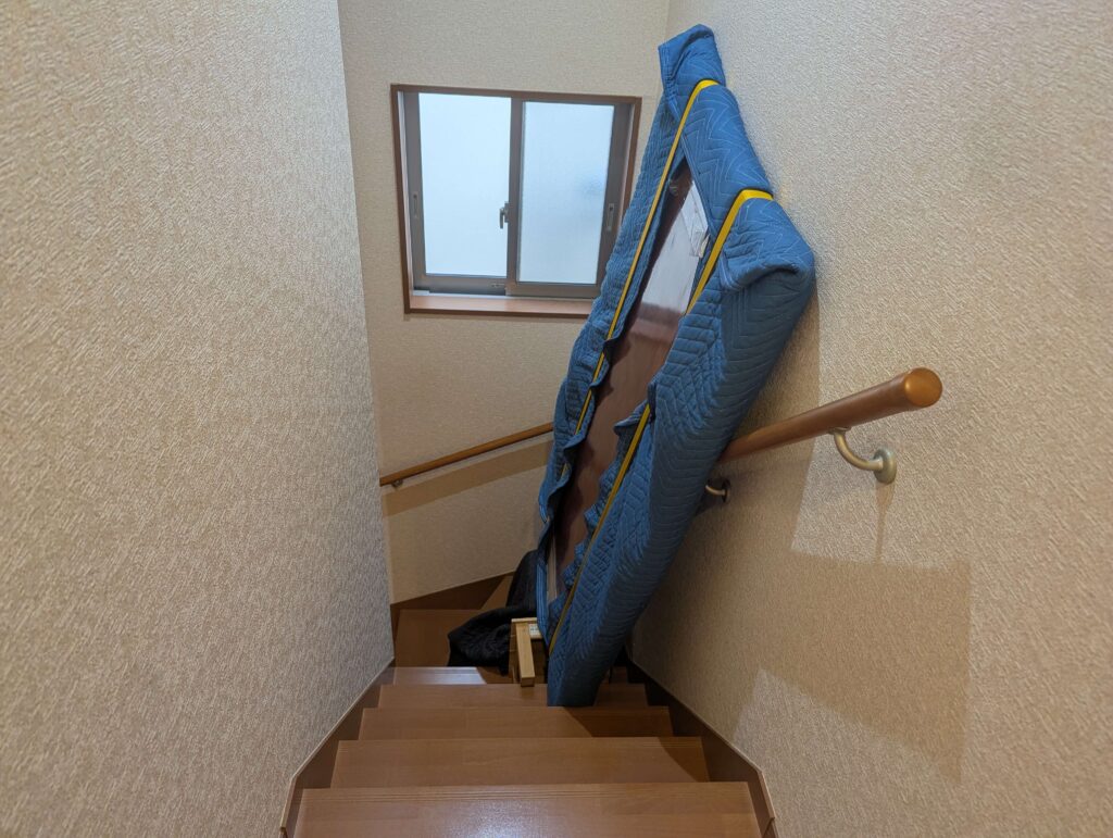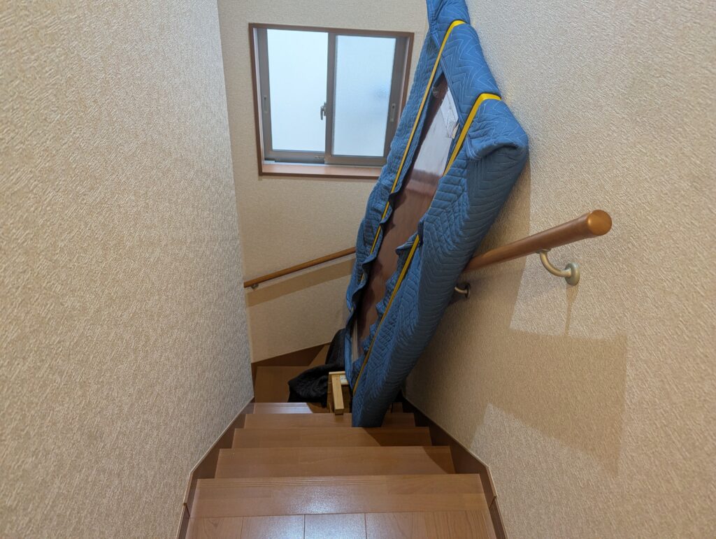 二階のリビングへ上げる階段では、一枚板を養生マットで包み荷締めベルトラチェットで締めて背負って上げるつもりでしたが、