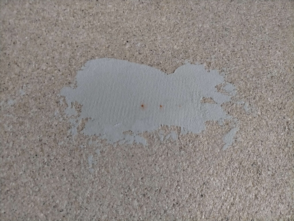 下地に釘の頭が残っていた場所の窪みを、そのままアンダーコートで埋めてしまいました。すると、漆喰を塗った後に錆色が浮き出てきてしまいました…。