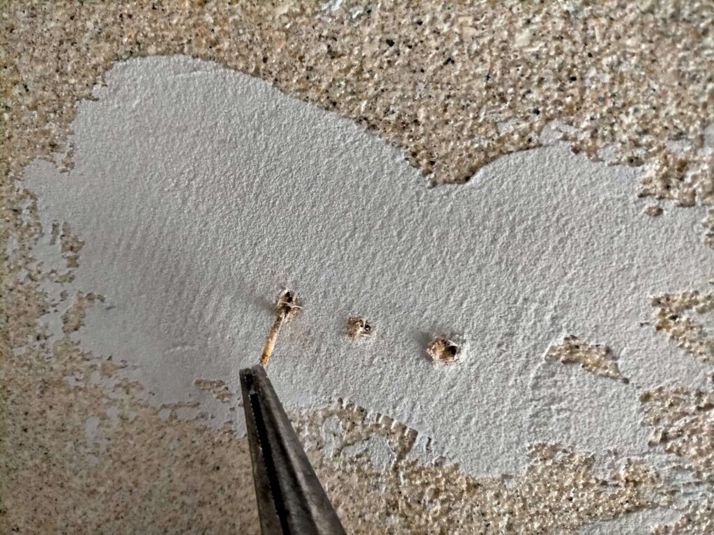 - 原因:穴の奥に、昔額縁を吊るしていた折れた釘が残っていたこと。
