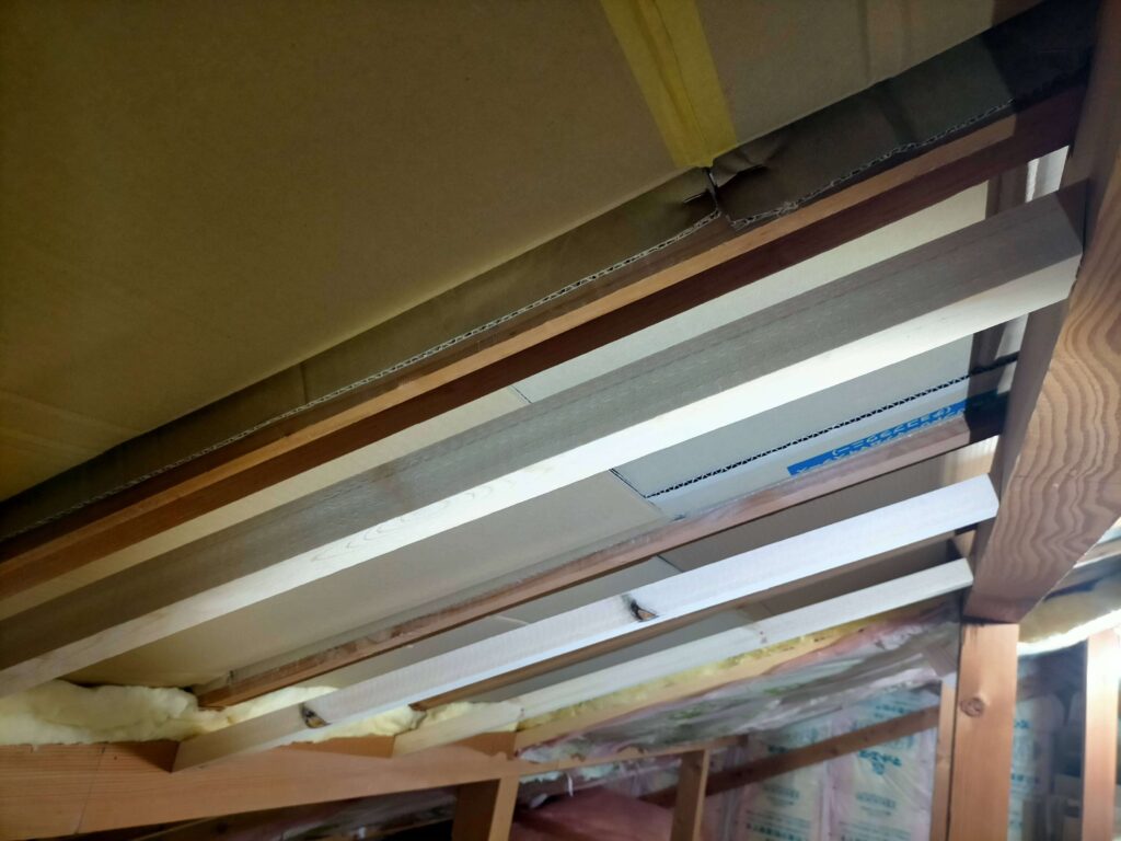 既存の垂木に沿って30×40mmでグラスウールをとめる下地を入れてから、