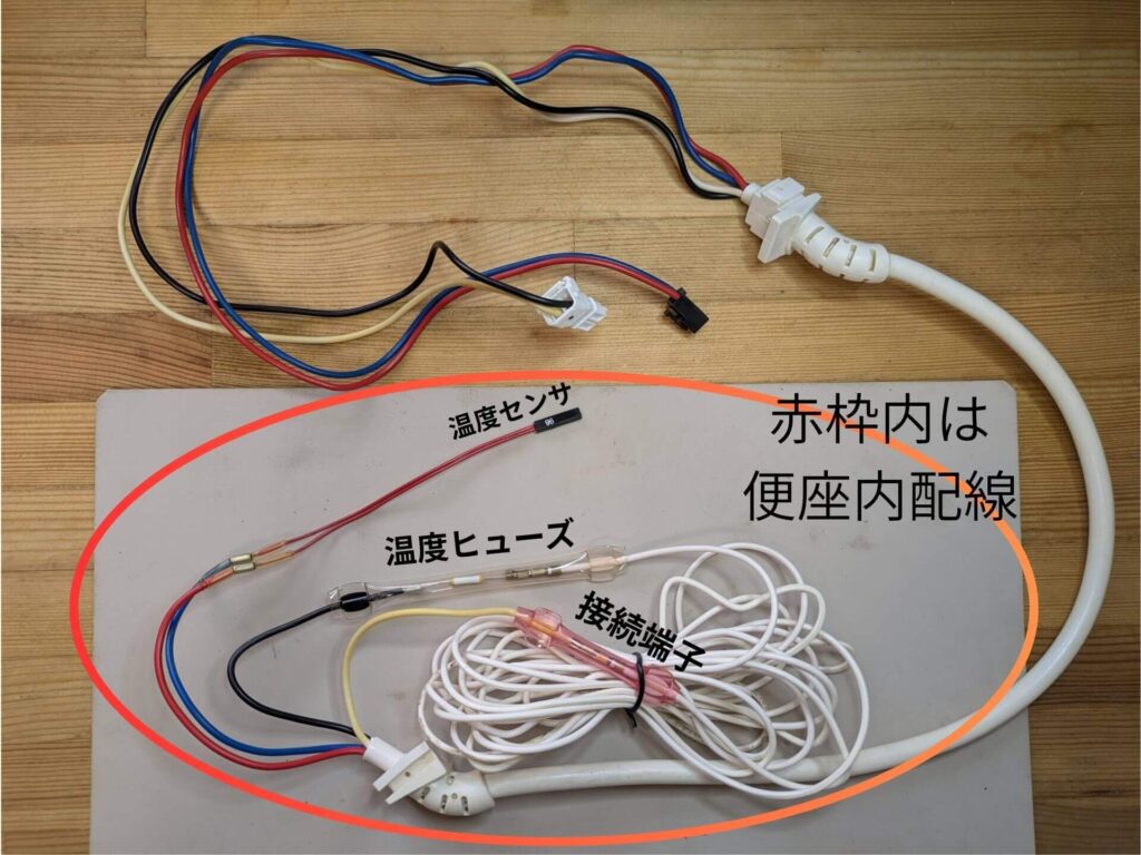 下の写真は便座内部のケーブルですが、熱線は白いシリコンゴムで覆われ、